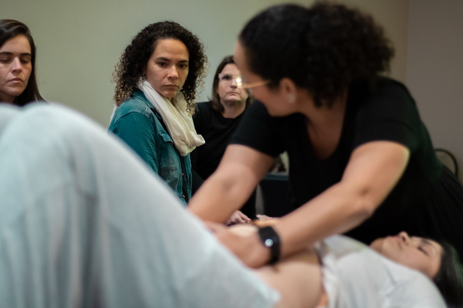 Tratamento das disfunções viscerais abdome e pelve, e suas relações com a coluna lombar. Tratamento dos bebês (também oferecemos um curso à parte, específico de pediatria).