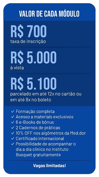 Ao concluir os dois módulos da Formação Busquet, você recebe um certificado oficial que valida seu conhecimento em uma abordagem sólida de avaliação e tratamento eficaz. Quando você entrega resultados, é você quem define o valor do seu trabalho.