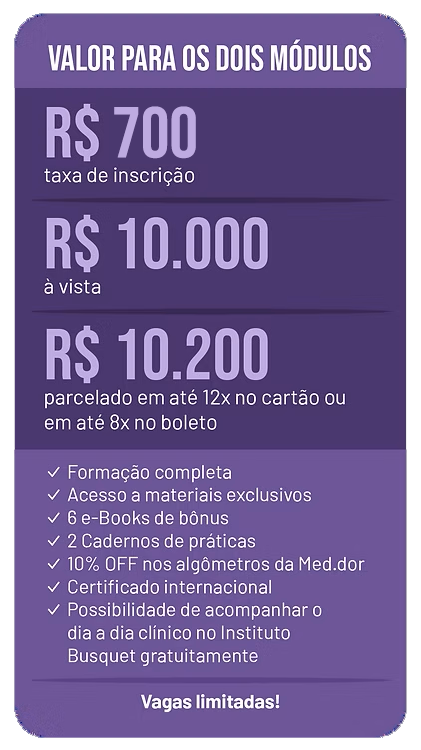 Transforme a vida dos seus pacientes e seja reconhecido como um especialista em tratamento das principais disfunções do movimento! Tenha muito mais segurança em atender casos complexos.